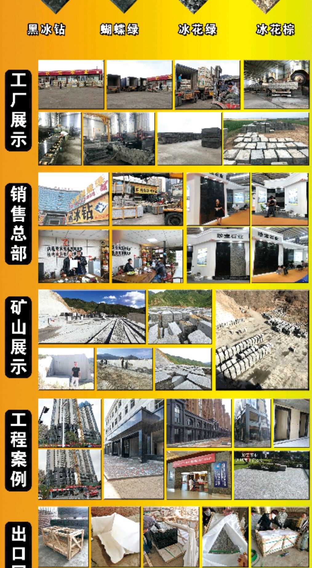 本公司在2017年投資山西黑冰鉆、蝴蝶綠、冰花綠礦山和工廠,現(xiàn)已正式生產(chǎn)大約年產(chǎn)量120萬平方左右,質(zhì)量穩(wěn)定、進(jìn)口品質(zhì)、價格優(yōu)惠、面向全國招代理合作商,本石材適合用于:外墻干掛、地鋪、樓梯、灶臺、園林 等大型工程。