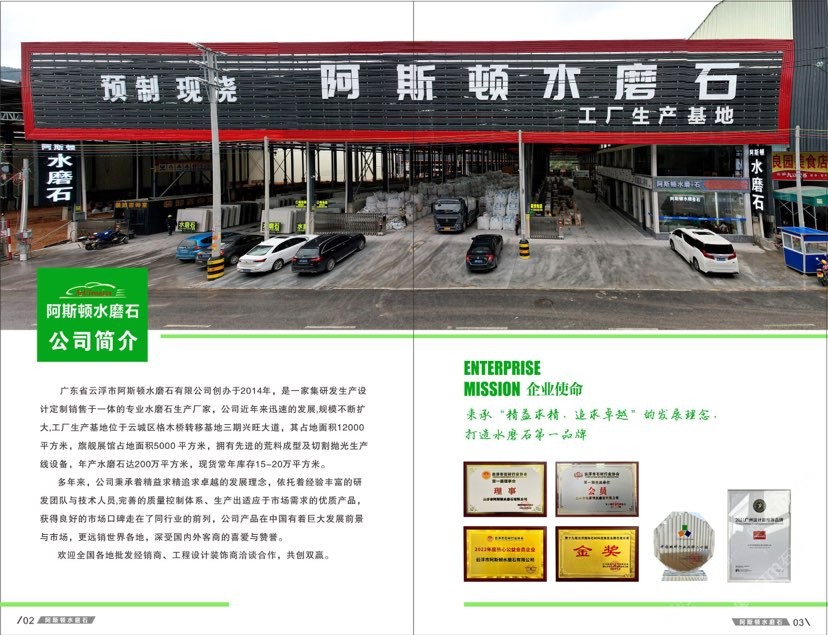 廣東省云浮市阿斯頓水磨石有限公司創(chuàng)辦于2014年,是一家集研發(fā)生產(chǎn)設(shè)計(jì)定制銷售于一體的專業(yè)水磨石生產(chǎn)廠家,公司近年來迅速的發(fā)展,規(guī)模不斷擴(kuò)大,工廠生產(chǎn)基地位于云城區(qū)格木橋轉(zhuǎn)移基地三期興旺大道,其占地面積12000平方米,旗艦展館占地面積5000 平方米,擁有先進(jìn)的荒料成型及切割拋光生產(chǎn)線設(shè)備,年產(chǎn)水磨石達(dá)200萬平方米,現(xiàn)貨常年庫存15-20萬平方米。 \\\