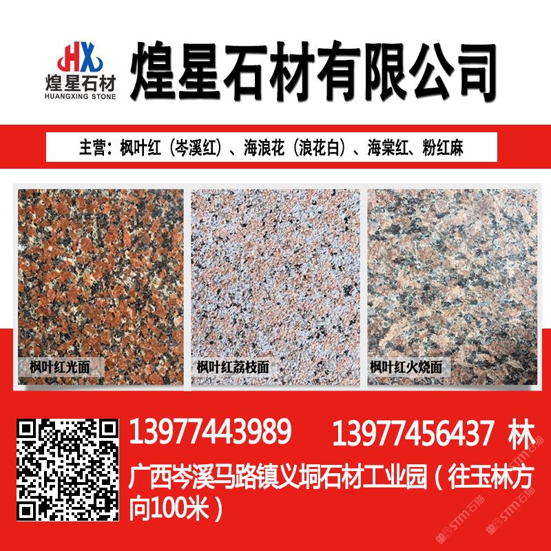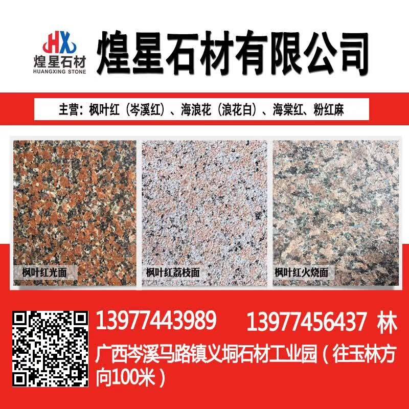 岑溪市煌星石材位于岑溪市馬路鎮(zhèn)義垌石材工業(yè)園,主要生產(chǎn)銷(xiāo)售:岑溪紅(楓葉紅),海浪花,海棠紅,三堡紅,粉紅麻,鐘山青,光板,毛板,火燒板,荔枝面,路沿石,異形板,大板以及各種工程板。\\\\\\\\\\\\\\\