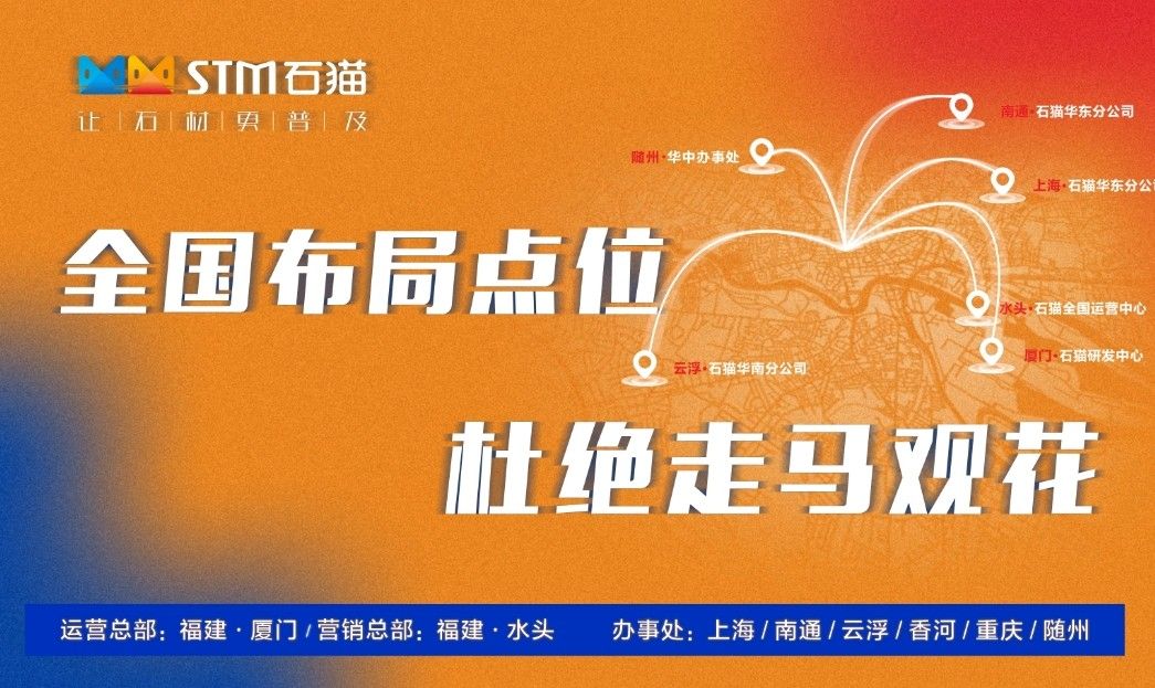 石貓科技股份有限公司駐華北分公司成立于2016年6月,市場(chǎng)主要覆蓋了北京、天津、河北、河南、山東、遼寧、內(nèi)蒙古、山西各省,基本實(shí)現(xiàn)了整個(gè)北方地區(qū)石材市場(chǎng)的全覆蓋。