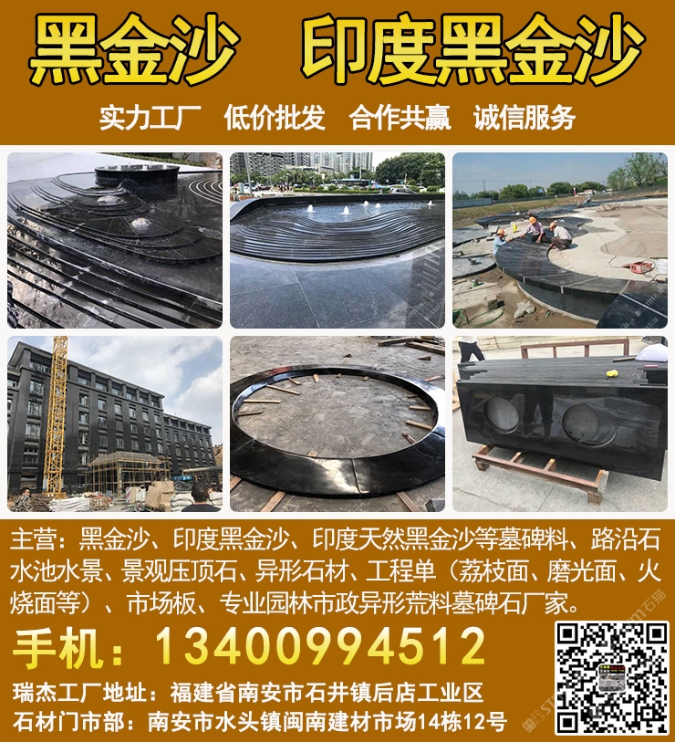 瑞杰黑金沙林總13400994512專業(yè)印度黑金沙供應商,實力石材工廠主要加工:黑金沙、黑金砂、印度黑金沙、印度天然黑金沙、印度黑色石材、印度黑石、黑金沙石材、黑金沙花崗巖、新礦黑金砂、國產(chǎn)黑金沙、新黑金沙石材等墓碑料、路沿石、水池水景、景觀壓頂石、異形石材、工程單(荔枝面、磨光面、火燒面等)、市場板、專業(yè)園林市政異形荒料墓碑石廠家,實力工廠、低價批發(fā)、合作共贏、誠信服務. 工廠地址:福建省南安市石井鎮(zhèn)后店工業(yè)區(qū),門市部:南安市水頭鎮(zhèn)閩南建材市場