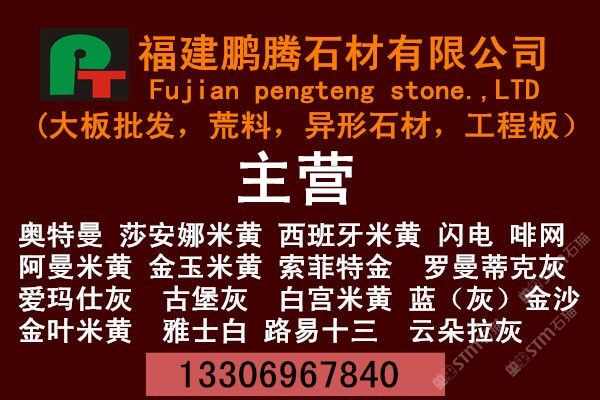 【鵬騰石業(yè)】專業(yè)加工出口超薄板材和超寬大板,并且在國(guó)內(nèi)外各大石材市場(chǎng)設(shè)有經(jīng)銷部和分公司,專業(yè)批發(fā)各種 大理石大板、花崗巖大板,并承接國(guó)內(nèi)外石材工程。