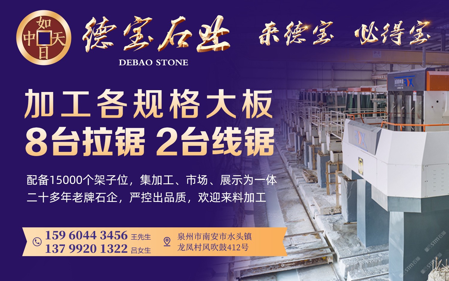 德寶大理石專業(yè)加工各規(guī)格大板,8臺(tái)拉鋸2臺(tái)線鋸,配備15000個(gè)架子位,是一家集加工、市場(chǎng)、展示為一體的二十多年老牌石企,嚴(yán)控出品質(zhì),歡迎來料加工!