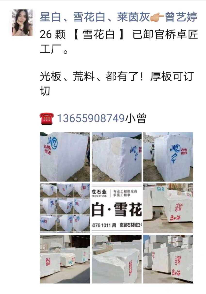 發(fā)布信息: 【 雪花白 】 荒料 : 馬上要安排下單切嘍 需要荒料、厚板 的來 現(xiàn)貨1.8cm 放在南翼石材城三號(hào)門四號(hào)倉三區(qū)