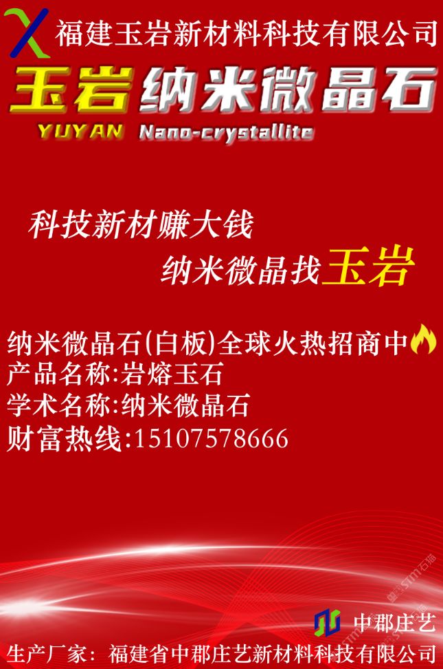 發(fā)布信息: 福建省玉巖新材料科技有限公司: 玉巖?納米微晶石 科技新材賺大錢?納米微晶找“玉巖” 納米微晶石(白板)全球火熱招商…… 財富熱線:15107578666 生產(chǎn)廠家:福建中郡莊藝(泉州)新材料科技有限公司(榮譽出品) 工廠地址:福建省南安市官橋鎮(zhèn)石雞山北路91號