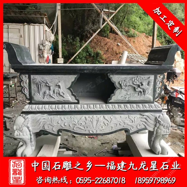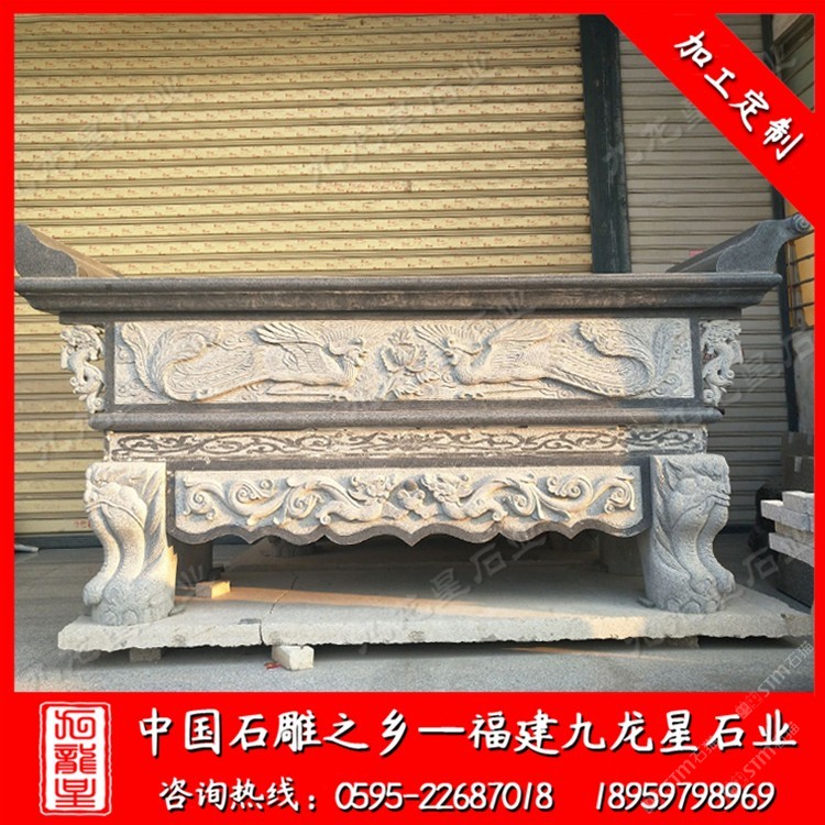 發(fā)布信息: 惠安石雕供桌報(bào)價(jià)格根據(jù)它的大小及工藝的復(fù)雜程度價(jià)格區(qū)間一般在8000-30000元每套。 九龍星石業(yè)是石雕供桌廠家,常年批發(fā)石雕寺廟供桌、石雕祠堂供桌、石雕家用供桌,歡迎咨詢我們(18959798969) 石雕供桌,經(jīng)常出現(xiàn)在寺廟或者是宗堂,用以在上面擺放祭祀的貢品。在有一些家庭當(dāng)中,人們也常常會(huì)擺放一張供桌,在家里進(jìn)行祭拜或是祭祀活動(dòng)等等。 石雕供桌整體看起來(lái)構(gòu)圖雖然簡(jiǎn)單,但布局勻稱,簡(jiǎn)單中帶點(diǎn)細(xì)節(jié),很多石雕供桌雖然造型簡(jiǎn)單,但主要都是在四周雕刻精致的圖案,一般整個(gè)桌角部分都是雕刻的主要部分,人們可以簡(jiǎn)單的雕刻也可以復(fù)雜的,復(fù)雜的在工藝上會(huì)比較有難度。對(duì)于佛前石雕供桌及家用石雕供桌,尤其在供桌尺寸上,至少高于你身體的一半,這樣才顯得對(duì)神像,祖先的尊敬。