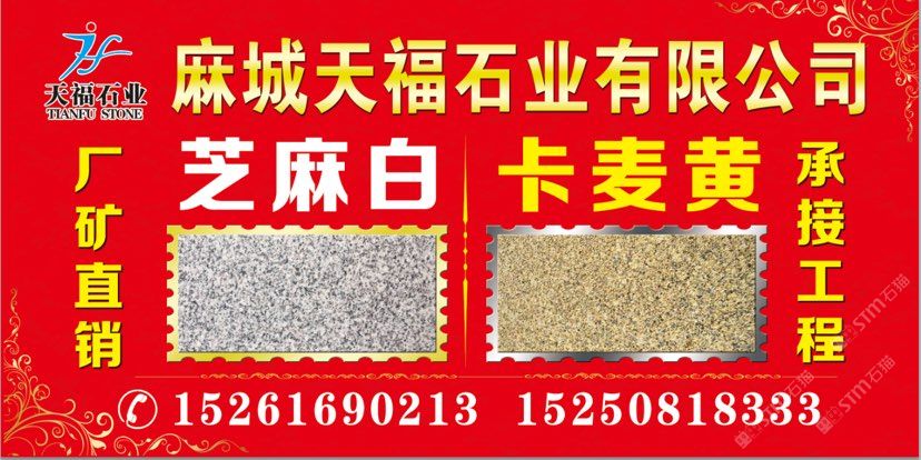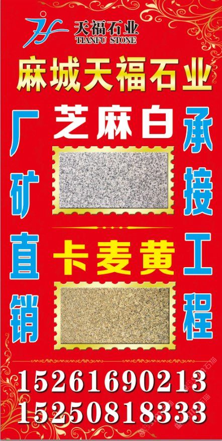發(fā)布信息: 天福石業(yè)【主營(yíng)經(jīng)營(yíng)】芝麻白(603#)、卡麥黃.602#.芝麻灰、銹石、黃金麻、卡拉麥里金·毛板、光板、火燒板,荔枝面成品板及臺(tái)階石、蘑菇石~路沿石、擋車(chē)石,圓球.圓柱.異形、仿形加工工藝品等。適合用于各種場(chǎng)合, 優(yōu)質(zhì)礦山資源以質(zhì)量求生存、以信譽(yù)求發(fā)展。聯(lián)系電話:15250818333