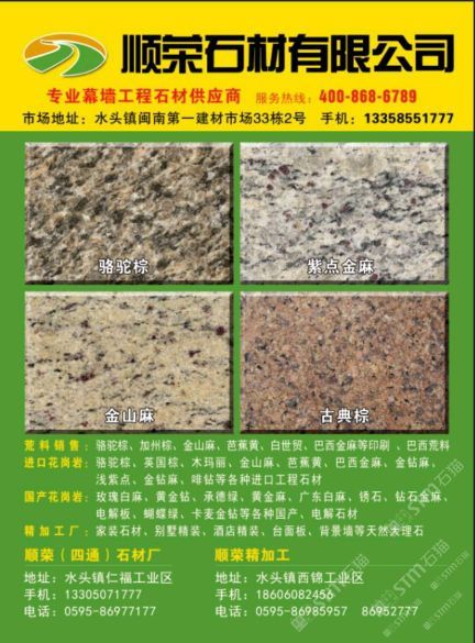 發(fā)布信息: 優(yōu)勢產(chǎn)品, 市場地址:水頭中閩市場綜合樓20--23號 花崗巖廠址:水頭鎮(zhèn)仁福工業(yè)區(qū)順榮石材 精加工廠址:水頭鎮(zhèn)濱海工業(yè)區(qū)順榮精加工 聯(lián)系:13358551777許自在, 18606984789王燕燕,