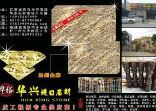 華裕(華興)石材主營產(chǎn)品:加州金麻,加州金麻(黑底),紫點金麻,紫點金麻1,淺紫點,美國白麻,美國灰麻,金山麻,世貿(mào)白,芭蕉黃1,安哥拉黑(黑水晶),安哥拉棕,安哥拉棕3,藍珍珠(11號礦),銀珠,綠星1,巴西金麻,海藍寶,印度蘭1,烏克蘭幻影藍企業(yè)地址:福建南安水頭鎮(zhèn)樸一村東大路區(qū)2號