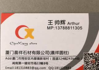 廈門晨祥石材有限公司主營產(chǎn)品:英國白麻,云朵拉灰(onur礦),實(shí)心圓柱(大理石),欄桿花瓶柱(大理石),動物雕刻(園林)企業(yè)地址:福建泉州南安市水頭鎮(zhèn)建材市場23棟6-8號